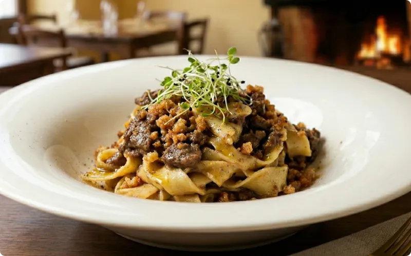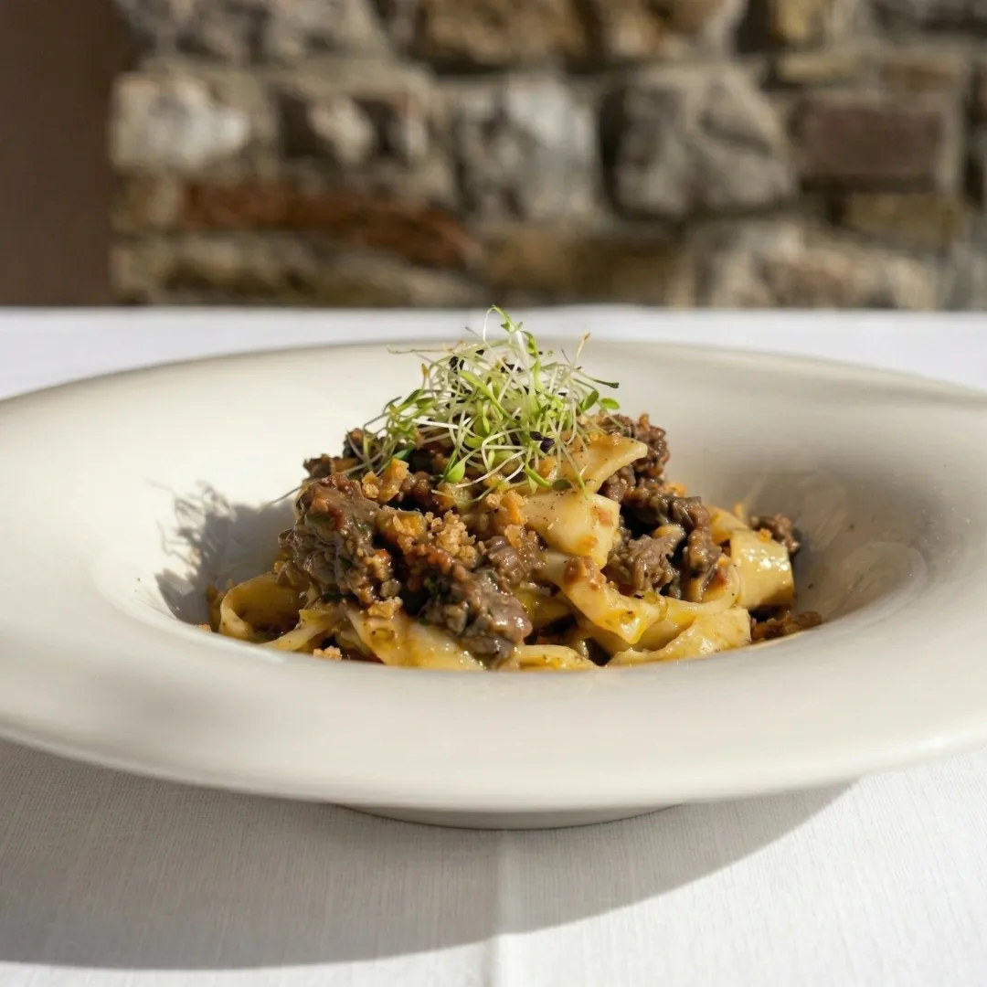 Pappardella stesa al mattarello con ragu di cinghiale e crumble di grasselli, un vero peccato di gola.